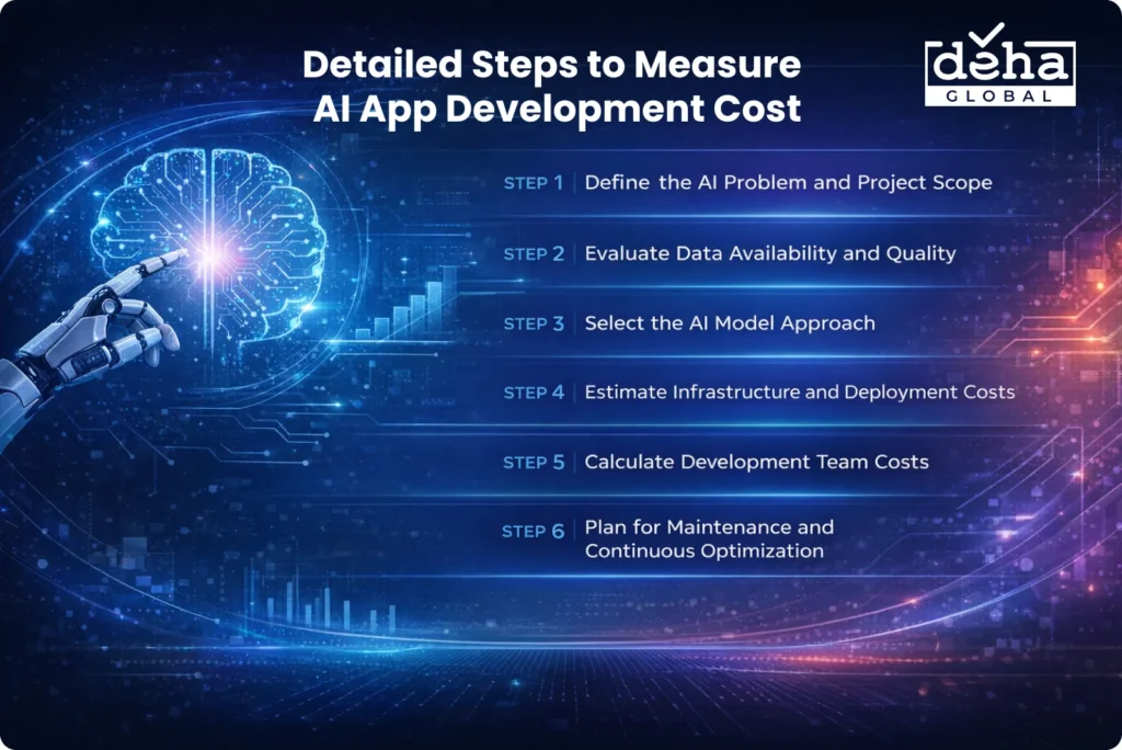 Accurately estimating AI app development expenses requires a structured and systematic approach. A step-by-step cost measurement framework helps organizations define project scope, allocate resources, and avoid unexpected financial risks.
