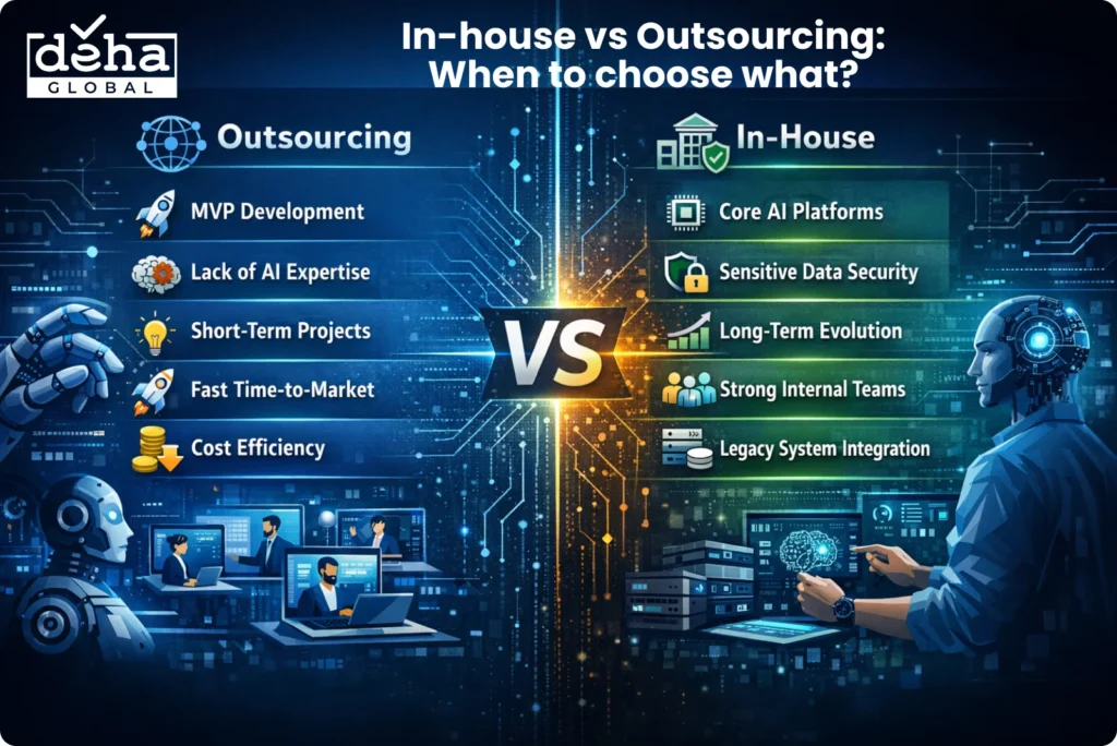 - Long-term Product Vision – For enterprises planning to make AI the heart of their future product roadmap, investing in an internal department fosters deep institutional knowledge and continuous evolution. However, if your goal is to validate a concept or launch a specific AI-powered tool rapidly, the flexible cost structure of outsourcing provides a more efficient path to a permanent competitive advantage.