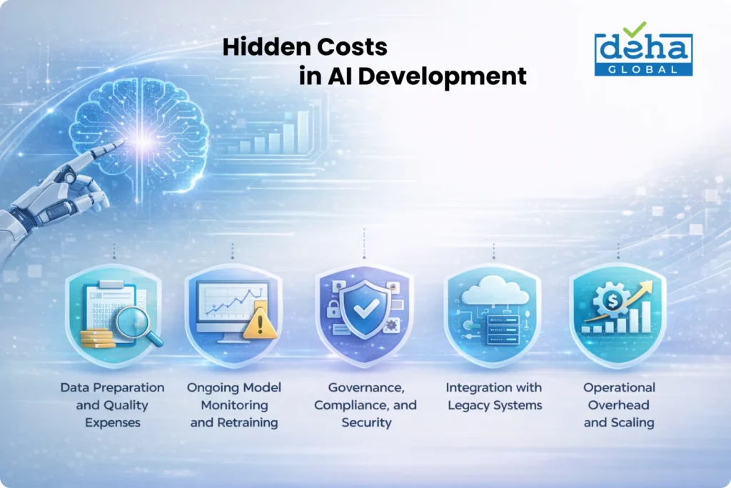 Beyond direct expenses like development and tooling, AI development projects often incur hidden costs that can inflate budgets and reduce expected returns. Understanding these potential hidden costs helps enterprises plan more realistic budgets and avoid surprises that can undermine ROI projections.