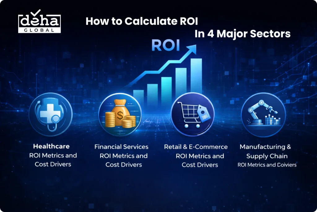 AI ROI calculation varies by industry, as each sector carries distinct cost structures, compliance requirements, and benefit timelines. A tailored ROI framework helps enterprises assess financial impact relative to AI cost and aligns expectations with industry realities.